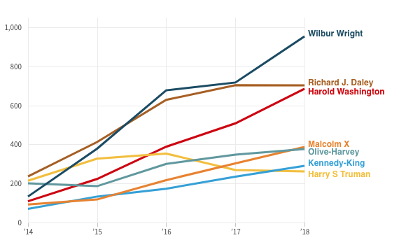 Between 2014 and 2018, the number of Chicago Public Schools students taking classes through the City Colleges of Chicago at their high schools has risen to 3,655 from 1,055. This chart shows how many courses were offered at each of the seven City Colleges of Chicago campuses.
